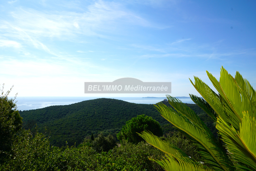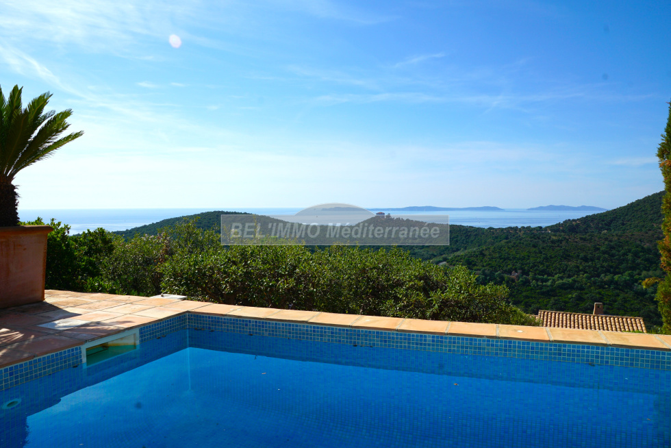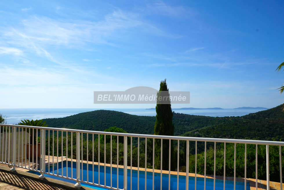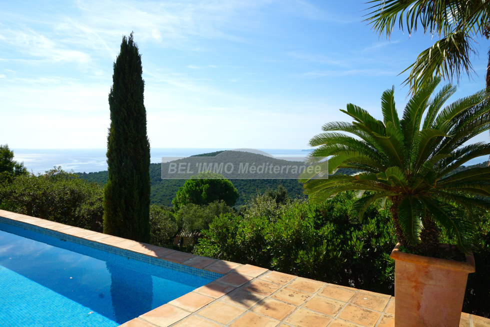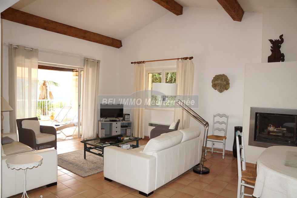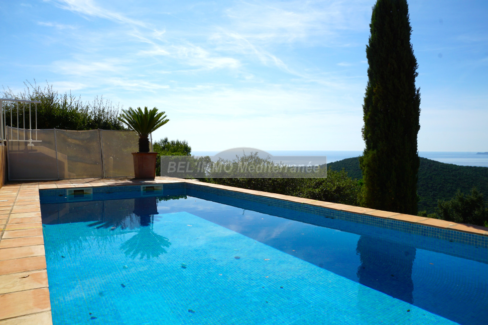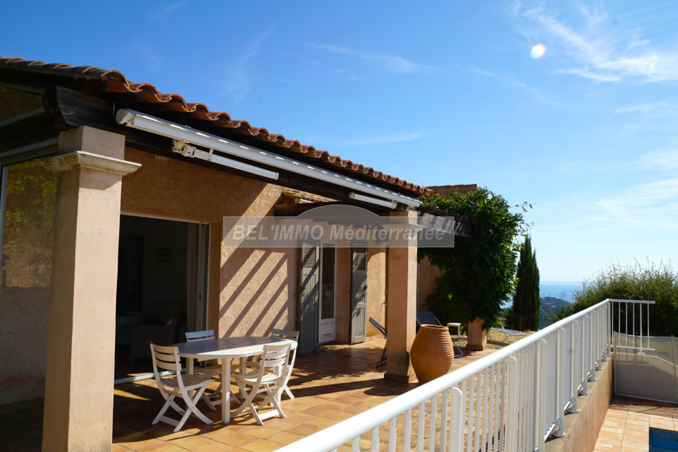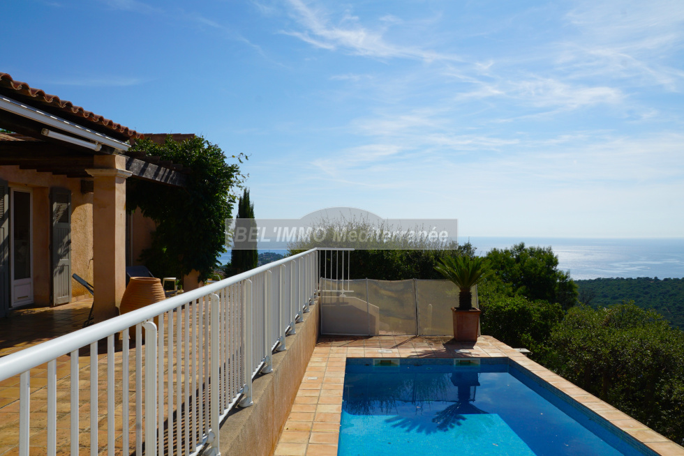 EXCLUSIVITE !! Superbe Vue Mer Panoramique ! Exposition Sud. Charmante Villa provençale de plain pied d'neviron 105 m² habitables comprenant : Entrée, séjour avec cheminée-insert donnant sur une grande terrasse couverte avec VUE MER, cuisine équipée, suite parentale avec penderie et salle d'eau/WC privative, 2 autres chambres avec penderie, salle de bains meublée. Garage en sous-sol et vide sanitaire. Piscine traditionnelle donnant sur la mer. Terrain clos de 720 m². RARE : Vue Mer panoramique et verdoyante (sans aucune construction en vue). A VISITER SANS TARDER