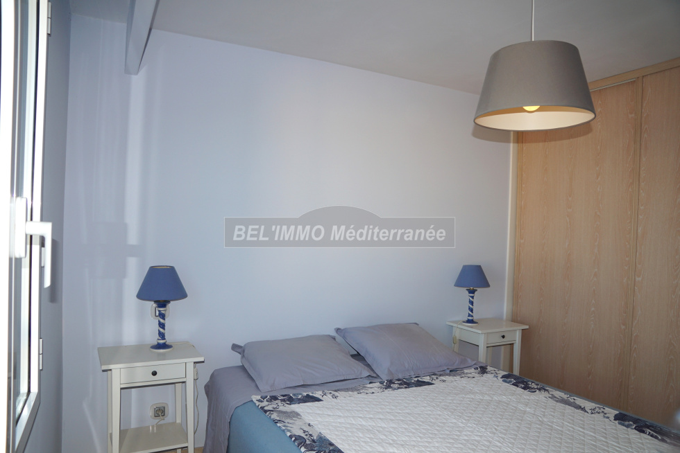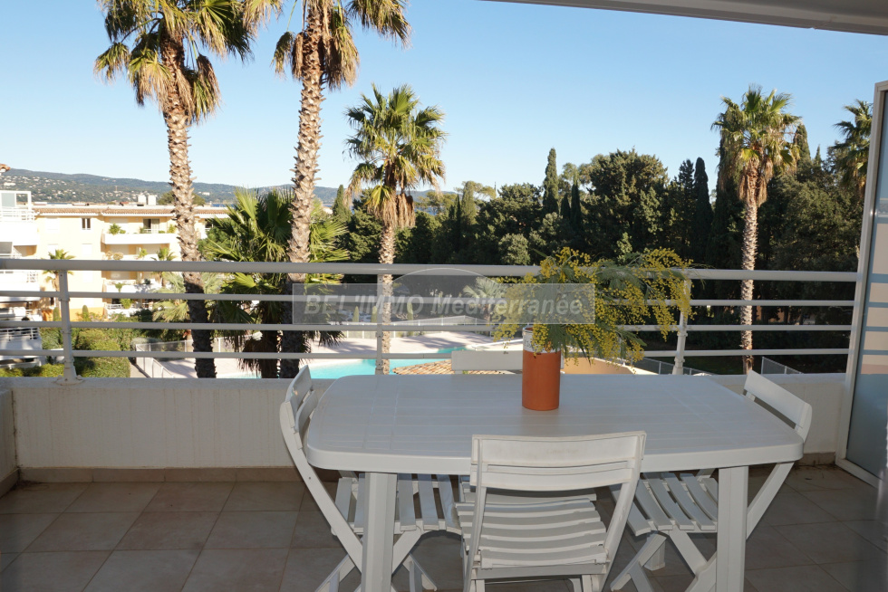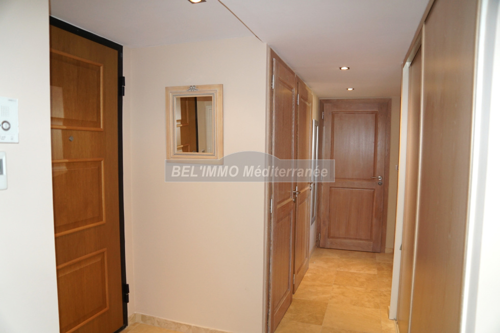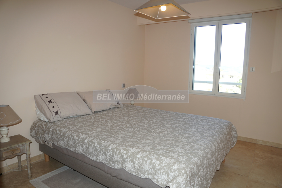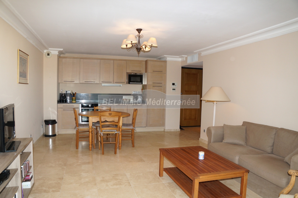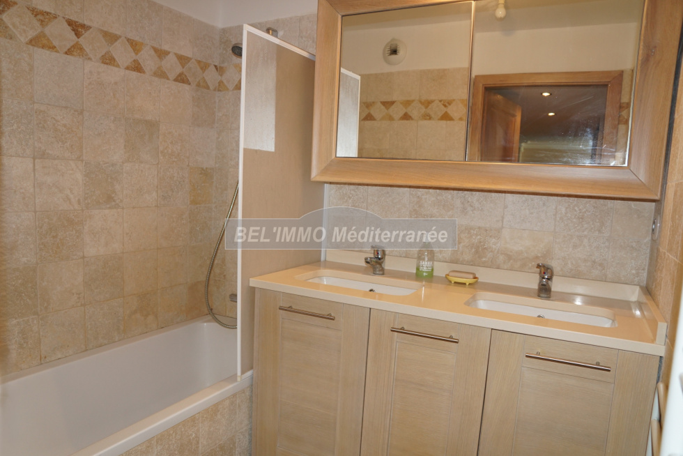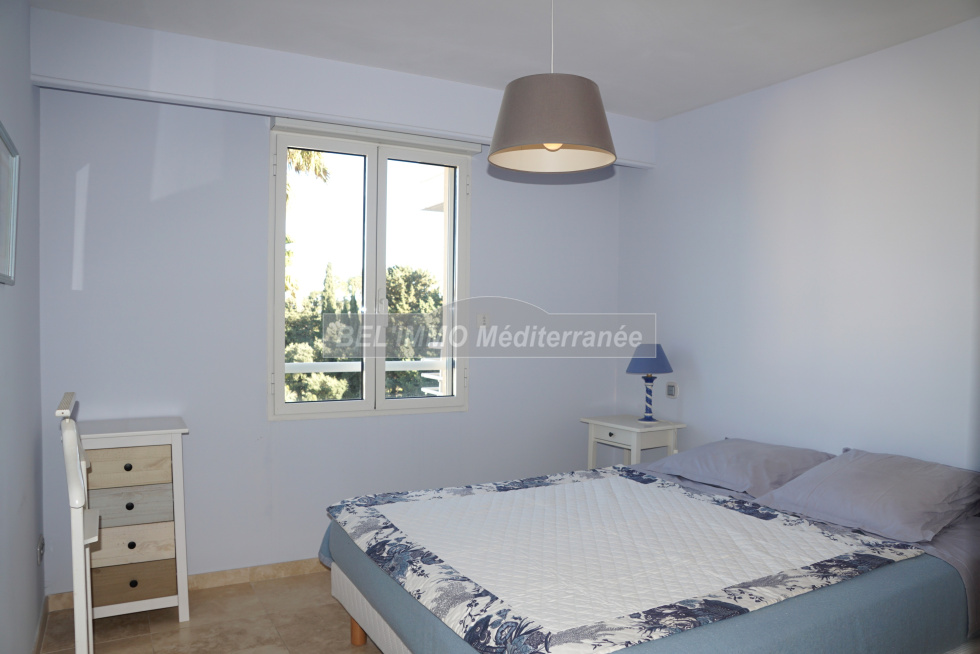 Situation idéale : en centre-Ville et au calme ! Résidence de standing, sécurisée et avec Piscine. Ce bel appartement 3 pièces de 62 m² habitables comprend entrée avec rangement, lumineux séjour avec cuisine ouverte entièrement équipée, 2 chambres avec penderie, salle de bains meublée et avec double vasque, WC avec lave-lains. Terrasse de 10 m² avec petite vue mer. Cave et Garage privatif en sous-sol. Prestations Haut de Gamme : pierre naturelle (sols et SdB), corniches, climatisation réversible, cuisine en chêne massif cérusé blanc, ascenseur, visiophone, grande piscine 18 m x 9 m.